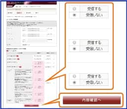 「eメール配信希望」の項目のチェックを外して「内容確認へ」ボタンをクリックしてください。アドレスを変更する場合は新しいアドレスを入力し、「内容確認へ」ボタンをクリックしてください。