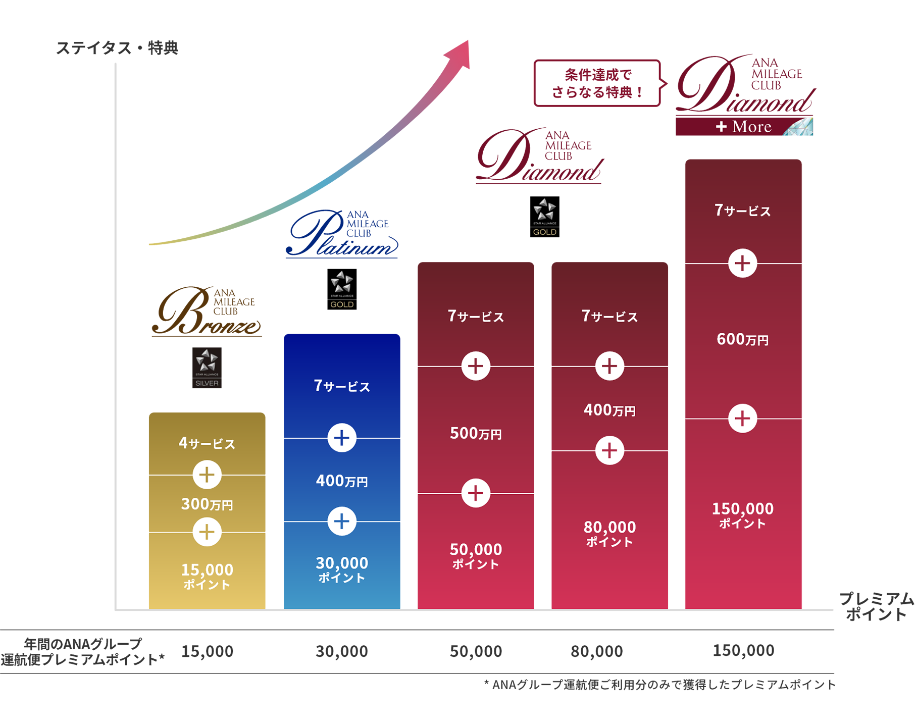 条件を達成された会員のご家族1名様(ANAカードファミリーマイルに登録済み)に翌年度「ダイヤモンドサービス」ステイタスをプレゼントします。
