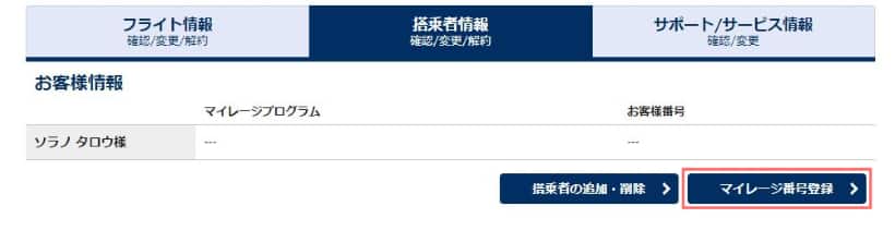 5. 予約詳細画面に戻り、「搭乗者情報」のタブを選択し、「マイレージ情報登録」をクリックします。