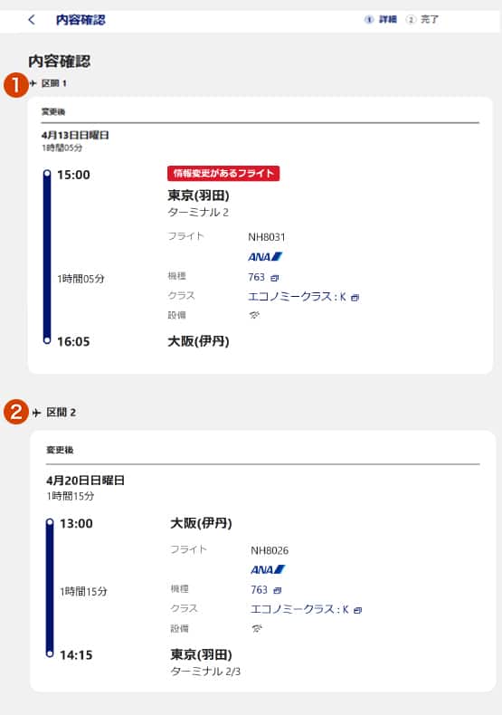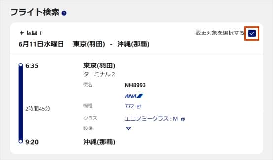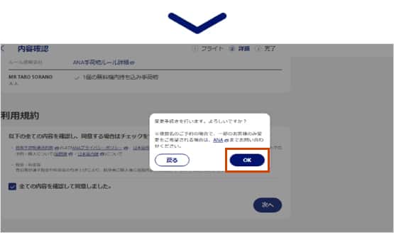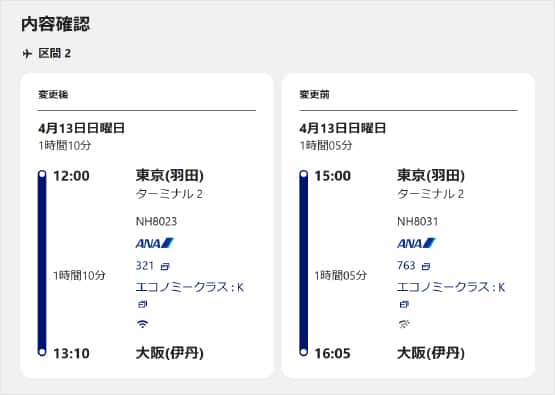 該当する便の右側にある「変更する」をクリックし、「確認画面へ」をクリックします。
