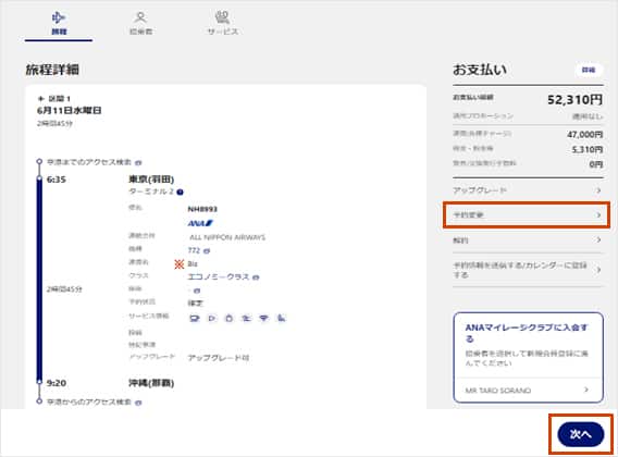 予約を変更したい便の「変更対象便を選択する」にチェックを入れて、画面下の「次へ」をクリックします。