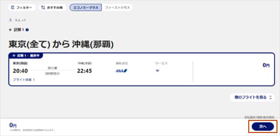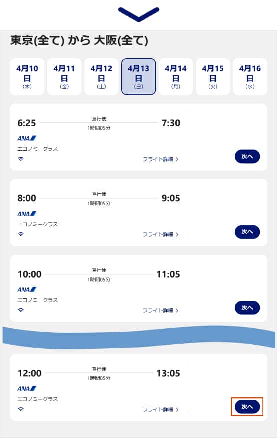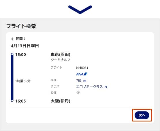 振替便として指定された便が表示されますので「次へ」をクリックします。