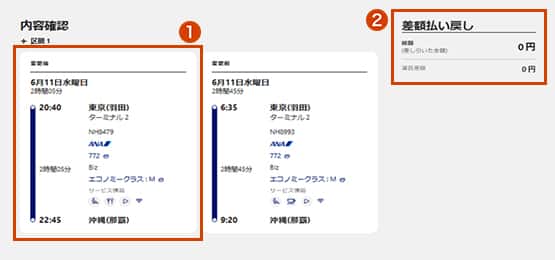 予約便の変更時に差額が払い戻しとなる場合は、払い戻し額が表示されます。