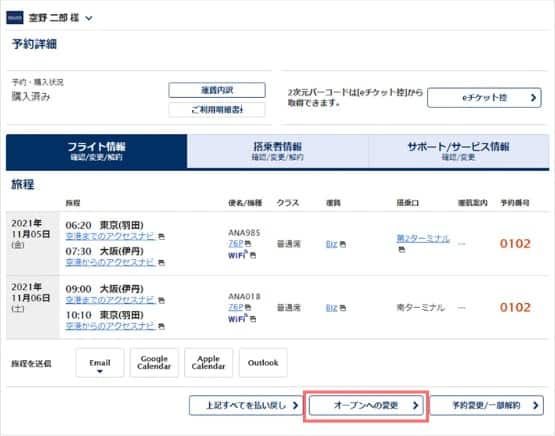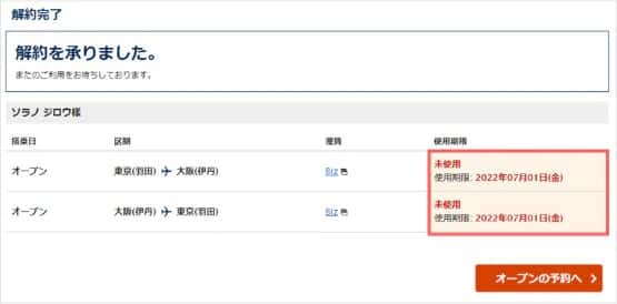 ここでは、予約を解約し、オープンチケットへ変更する手順を説明いたします。