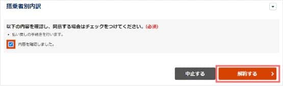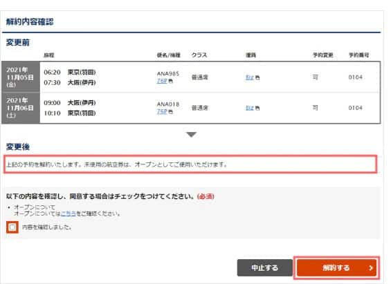 解約操作後は、オープンとなることを確認し、「内容を確認しました」にチェックをつけて「解約する」をクリックします。