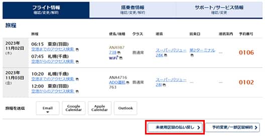 例)2023年11月2日 ANA987便 東京(羽田)ー札幌(千歳)は搭乗済み(使用済み)
