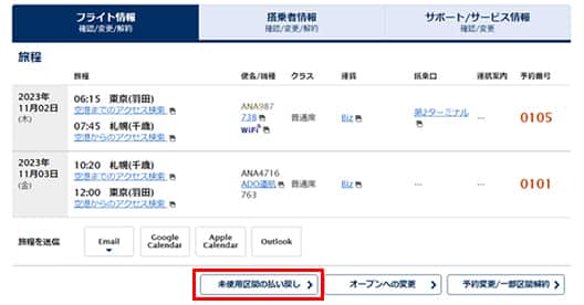 未使用の航空券を払い戻しする場合は「未使用区間の払い戻し」をクリックしてください。