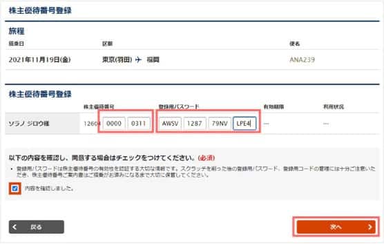 株主優待番号ご案内書にある、株主優待番号と、登録用パスワードを入力し、内容に同意後、「内容を確認しました。」にチェックをつけて「次へ」をクリックします。