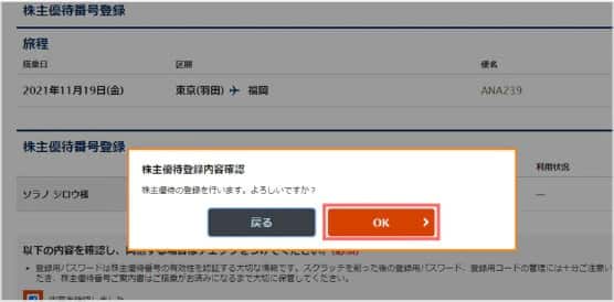 株主優待番号の内容を確認後、「OK」をクリックします。