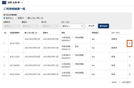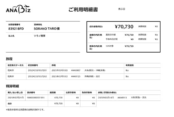 ANA Bizで購入した航空券の運賃や手数料の履歴と合計を出張者ごとの購入単位で確認することができる明細です。