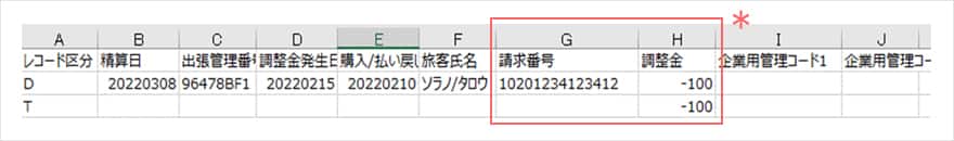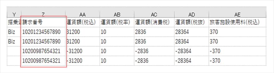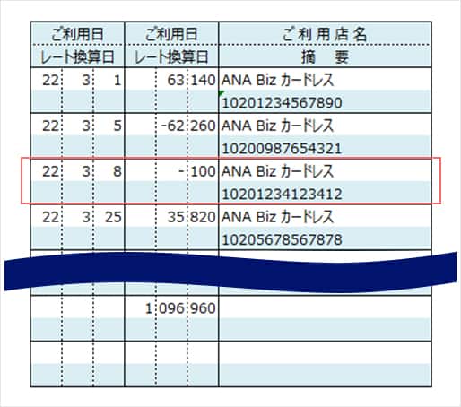 JCBからの請求内容の詳細を確認するには、摘要欄にある14桁の番号とANA Bizの請求番号を照合することでご利用者様の情報を確認することができます。