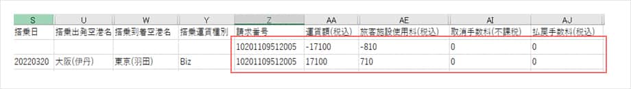 航空券は1区間ごとに記載されるため、2区間以上購入した場合は、複数行にまたがります。
