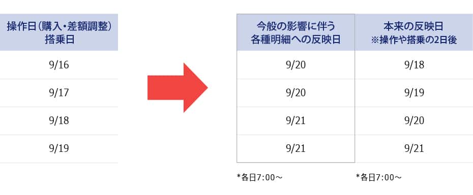 9/18、19購入や差額調整、搭乗のデータは9/21 07:00に反映されます。