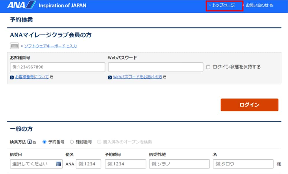 (2)予約検索へ進まず、ANA Bizログインするために「トップページ」へお進みください。
