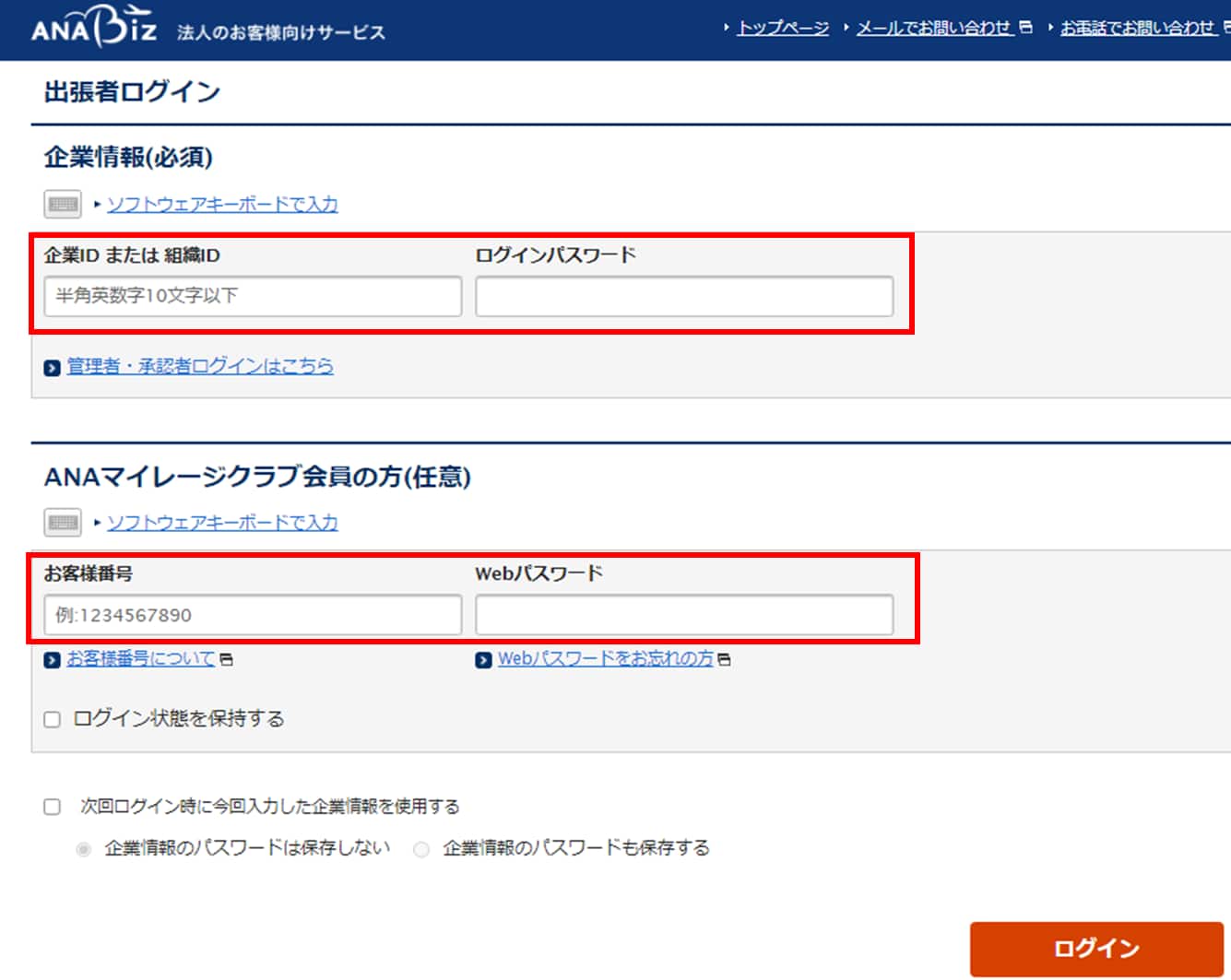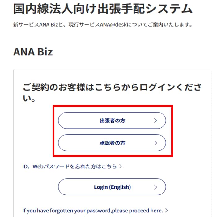 企業様で導入している出張システムからANA Bizに接続している場合は、以下の方法ではANA Bizへログインできません。