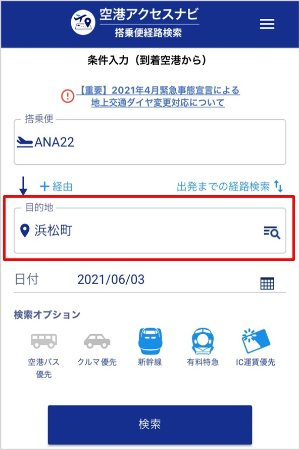 羽田空港発着いずれかを含む、任意の経路を検索します。