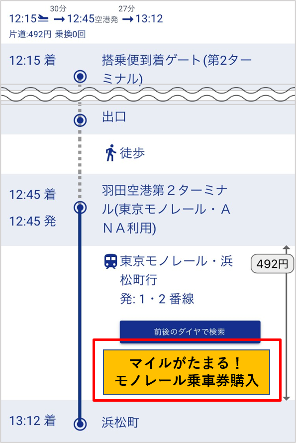経路一覧から東京モノレールを使用する経路を選択し、経路詳細に進みます。