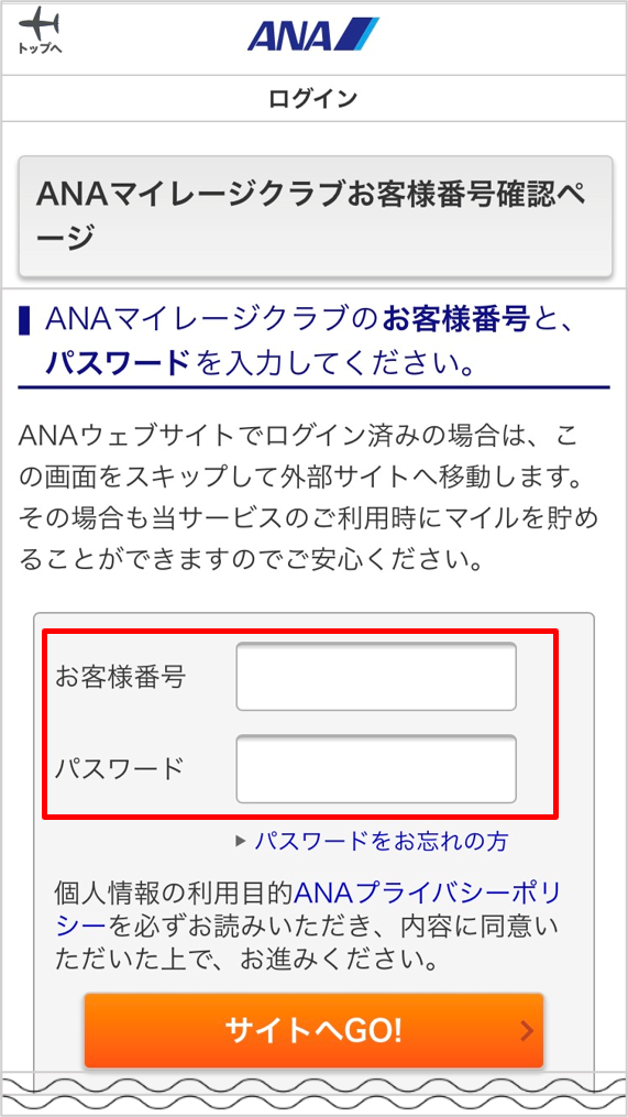 ANAマイレージクラブお客様番号をご入力される際、間違いのないようご注意ください。