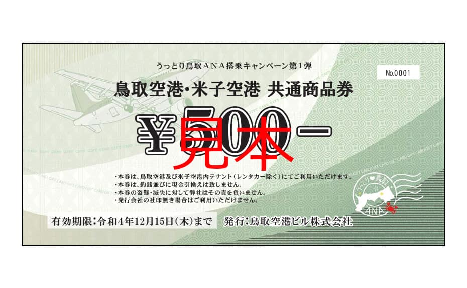 鳥取・米子空港で使用できる商品券1,000円分(500円×2枚) 各空港でそれぞれ先着500名様