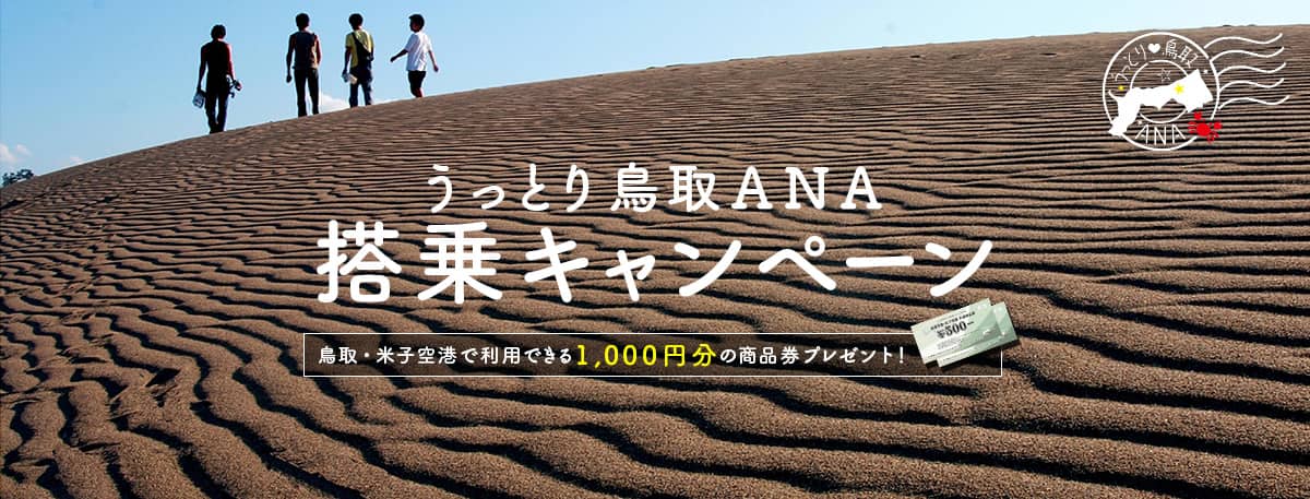 キャンペーン対象期間中、ANA羽田発=鳥取線・米子線をご搭乗いただき、鳥取・米子空港の総合案内所でピンクの「ご搭乗案内」をご提示いただくと、鳥取・米子各空港で使用できる1,000円分の商品券を各空港で先着500名様にプレゼントいたします。