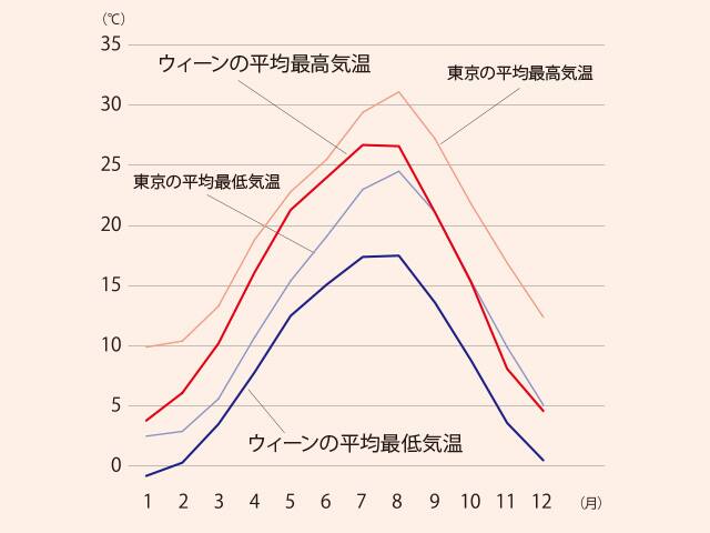 | 月 | 東京の平均最高気温 | 東京の平均最低気温 | ウィーンの平均最高気温 | ウィーンの平均最低気温 |
