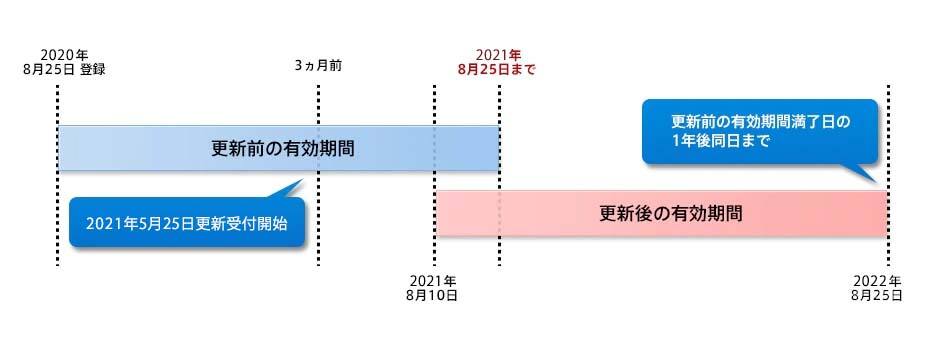 有効期限の更新手続きは、有効期間満了日の3カ月前〜1年後まで申し受けます。