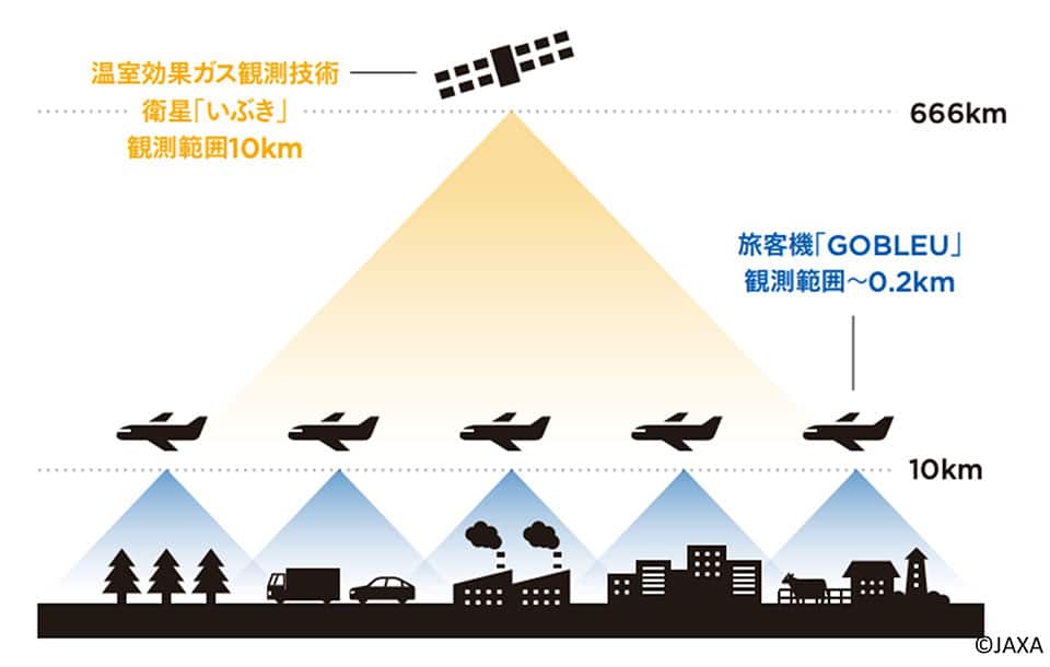 観測機器「いぶき」では、高度約666kmの宇宙から、地上で反射した光の量を観測し大気成分の濃度を計測しますが、この共同研究においては、ANAの飛行機に観測機器を乗せて上空約10kmの高さから観測するため、より高解像度で詳細なデータを得ることができます。