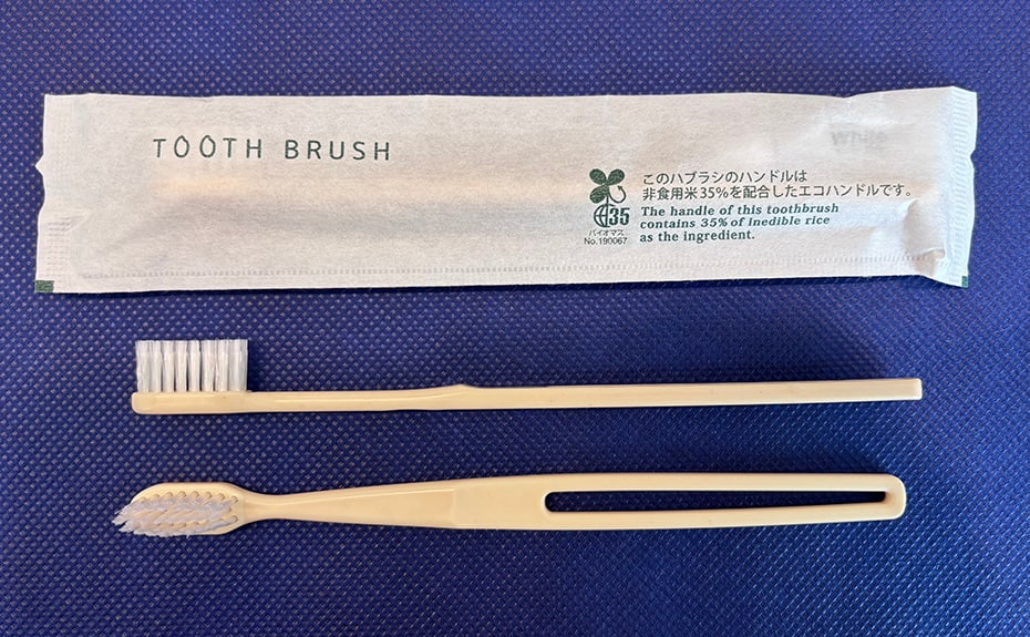 ラウンジ内にあるシャワールームでは、歯ブラシやスリッパなどのアメニティを提供していますが、このたび、環境配慮型の素材を使用した製品にリニューアルしました。