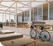 目の前には海と空が広がり、絶景に包まれています。サイクリングだけでなく数多くのアクティビティが揃えられており、しまなみと瀬戸内海を存分に満喫できる宿です。