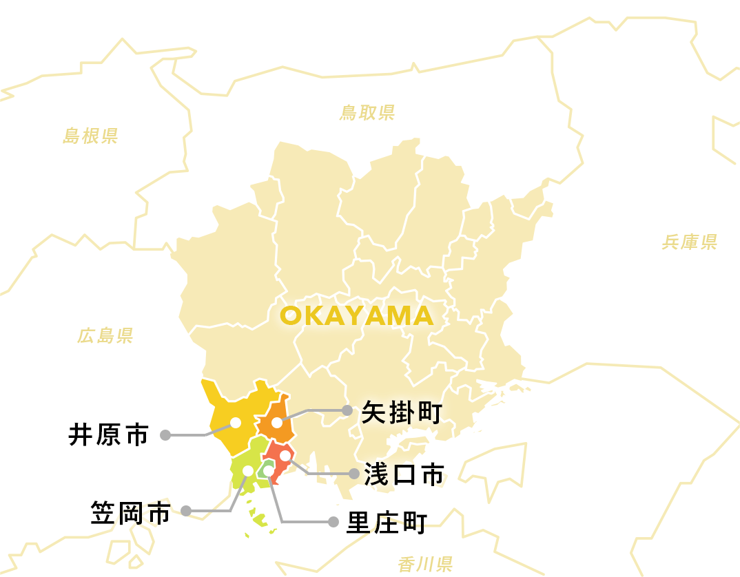 井笠地域とは岡山県南西部の笠岡市・井原市・浅口市・里庄町・矢掛町の3市2町を総称した地域です。