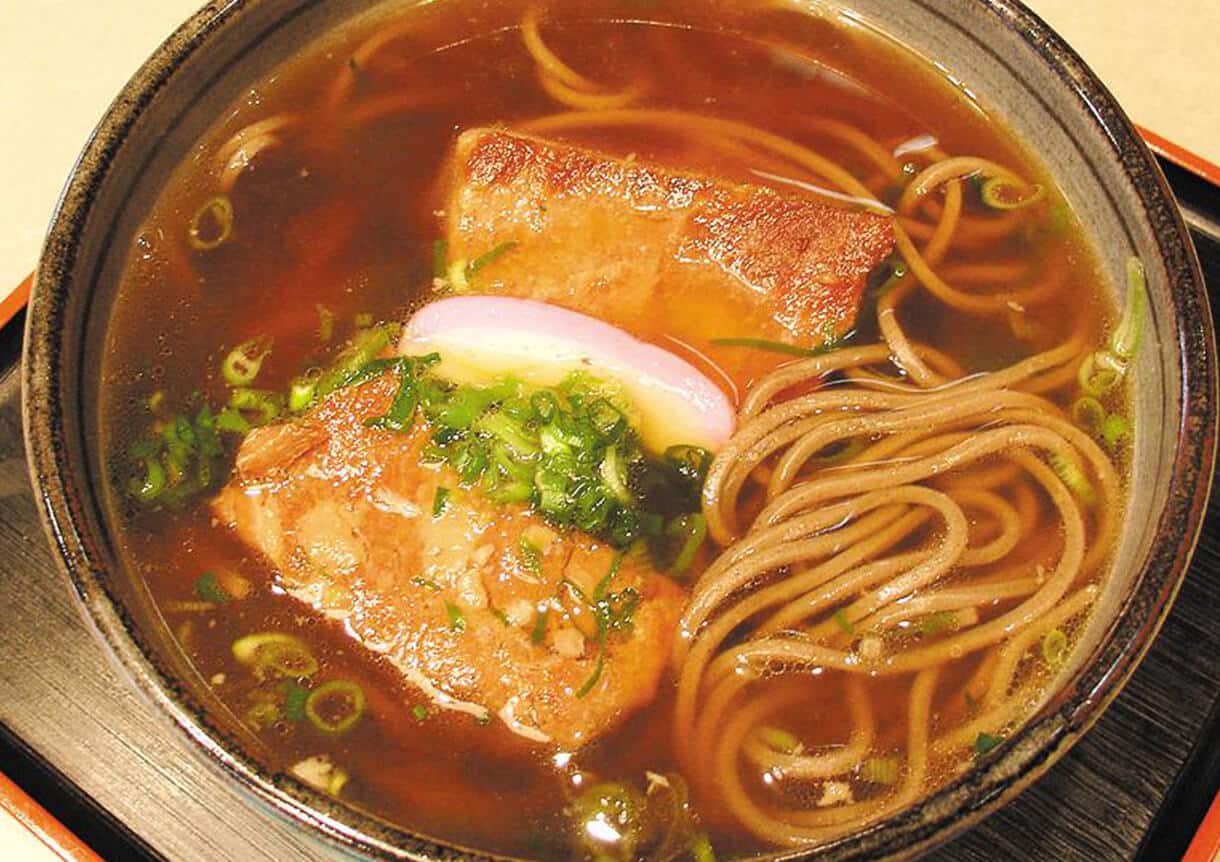 美星産の豚と県内産の豚を使用し、やわらかく煮込んだ豚の角煮をのせた角煮そばは、豚のほど良い辛さとそばの食感が良く合い人気が高い一品です。
