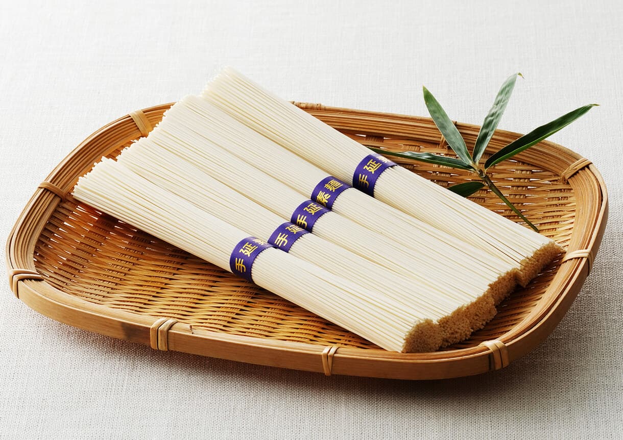 江戸時代から、晴れが多い気候や、良質な水・塩・小麦が手に入ることから、手延べ麺の産地として栄えてきました。手延べ麺は包丁を入れることなく、生地をひたすら伸ばして伸ばして作られます。手間と時間がかかっている分、繊維が伸び、のど越しつるりとした上品な味わいが特徴です。