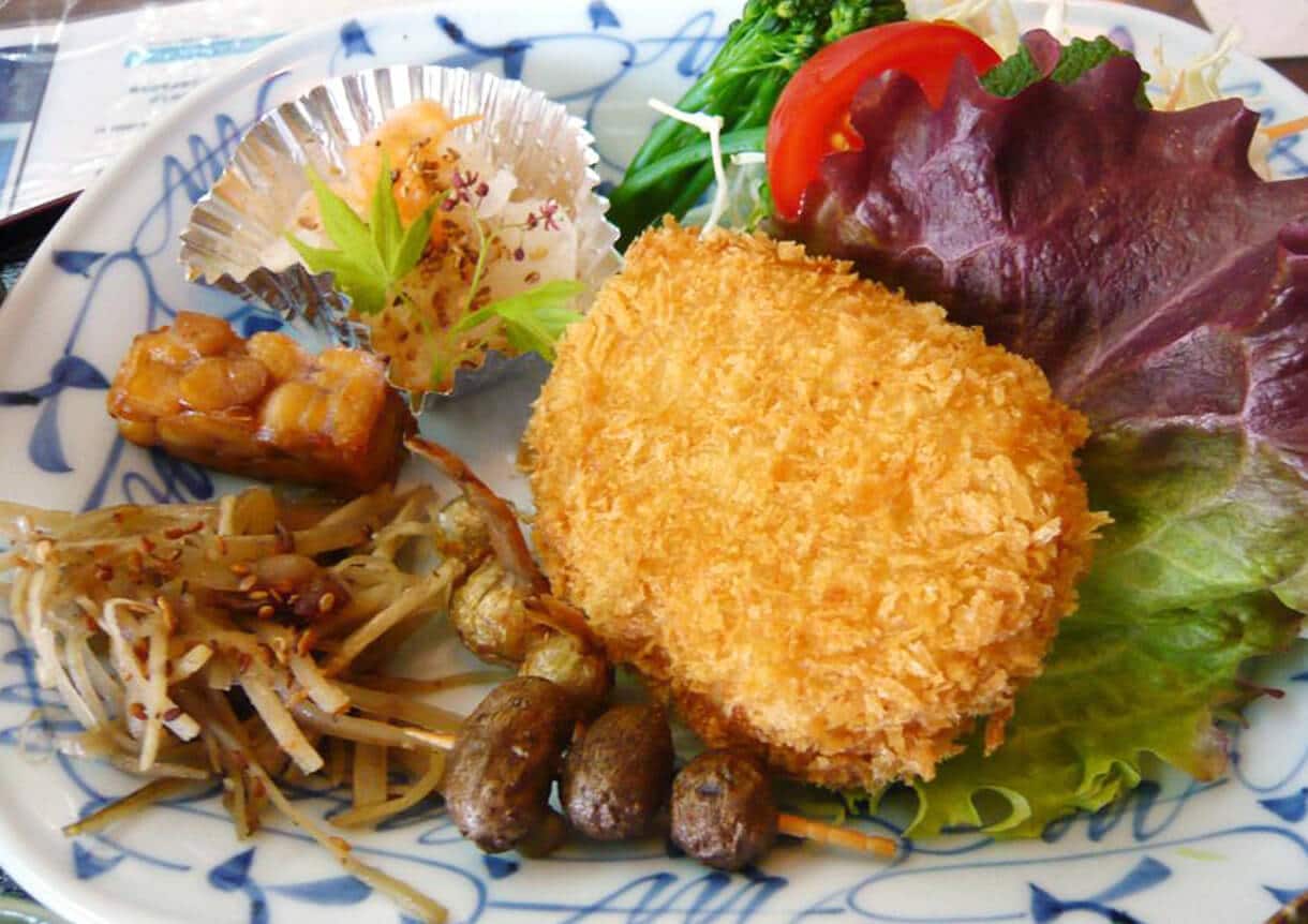 「テンペ」とは、大豆の発酵食品で血糖値が下がるとも言われる健康食品です。矢掛テンペでは、テンペ粉やテンペを使用したお菓子などを販売しています。そのなかでも、人気があるのがテンペコロッケ!街歩きのおやつにピッタリ!