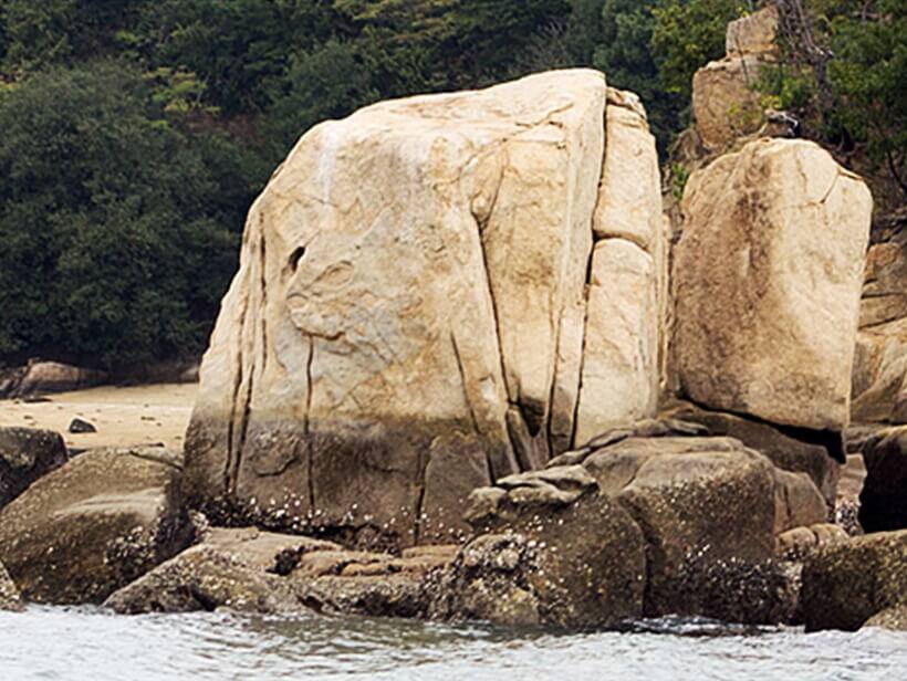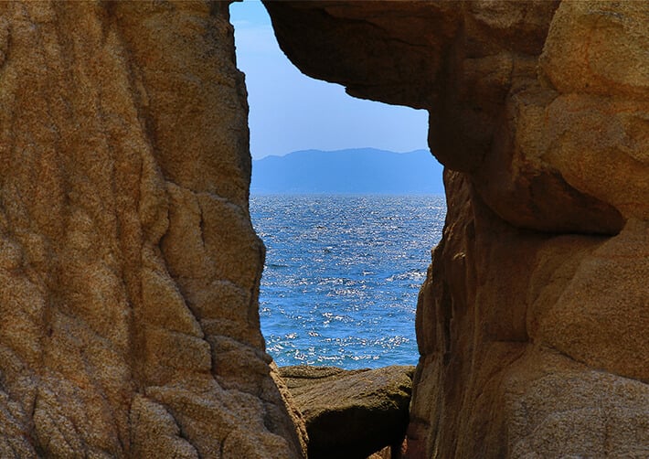 住吉港から約8km沖合の高島は笠岡諸島最北端に位置し、国の名勝に指定されています。