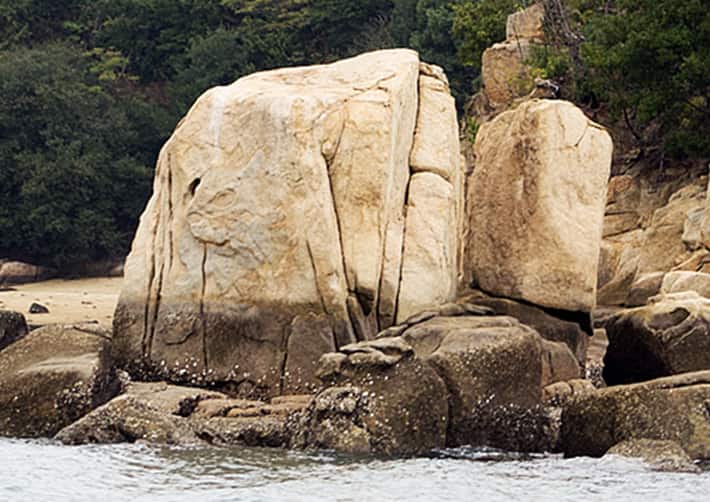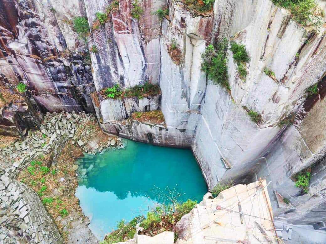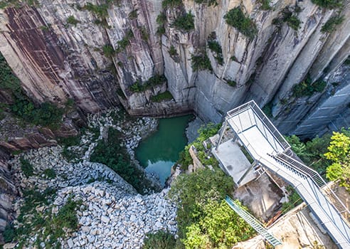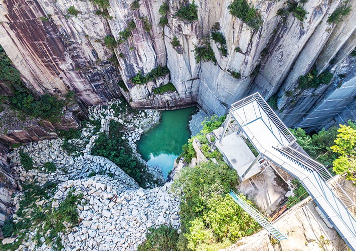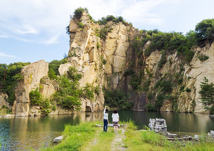 北木島は古くから花崗岩の産出、加工で「石の島」として栄えてきました。高品質の石を求めて地下深くへと掘り進み、その結果、天に向かってそそり立つ断崖絶壁が誕生。この丁場では現在も採石が続いており、高さ約60mの石切りの渓谷展望台からその壮大な景色を堪能できます。