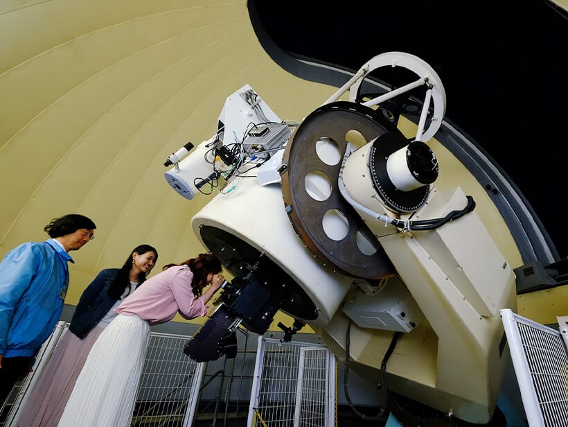 美星天文台では、どなたでもお気軽に口径101cm望遠鏡を使ってさまざまな天体を見ることができます。金曜から月曜の晴れた夜間(18:00-22:00)には季節の天体を、昼の開館時には立体映像「4D2U」を用いた最新の宇宙の紹介や、昼間の一等星をご覧いただけます。高度な天体観測にも利用できますが、初めて望遠鏡をのぞく人や家族連れでも気軽にスターウォッチングを楽しむことができます。