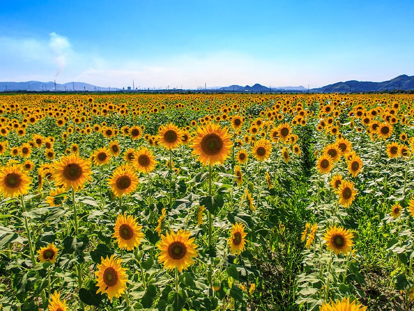 また、岡山県屈指の花畑として有名で、なかでも干拓地のヒマワリの花畑は圧倒的なスケールで、開花を迎えると連日多くの人で賑わいます。