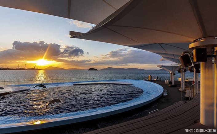 瀬戸内海や太平洋・黒潮など、日本屈指の圧倒的な水景・四国水景をテーマにした水族館です。瀬戸内海を背景にイルカたちが躍動する「海豚プール」にも注目!