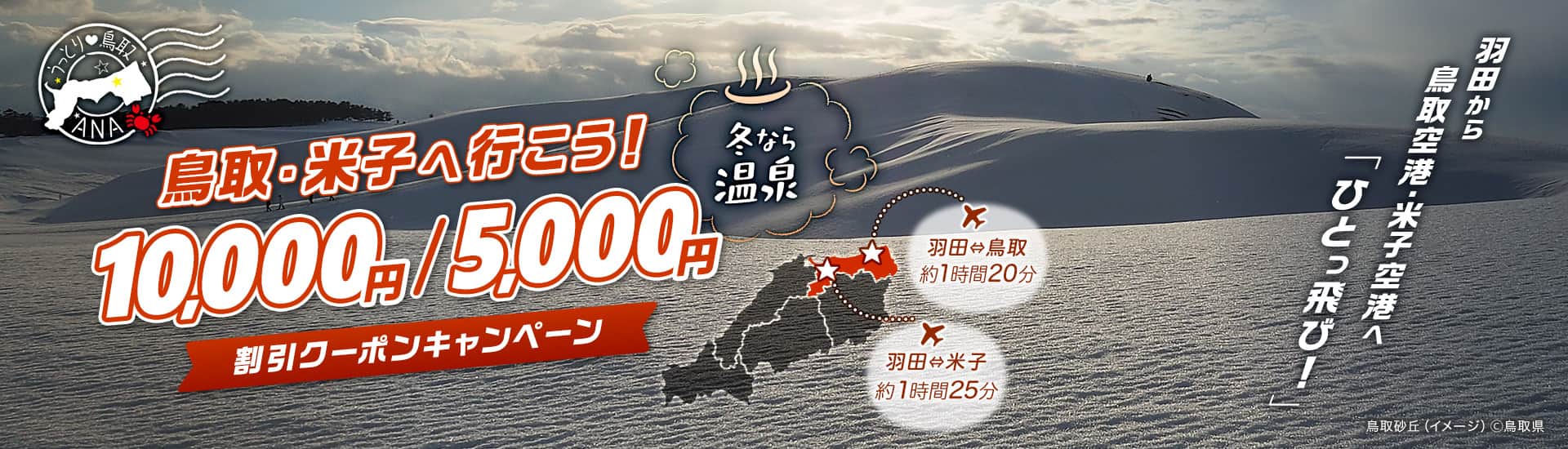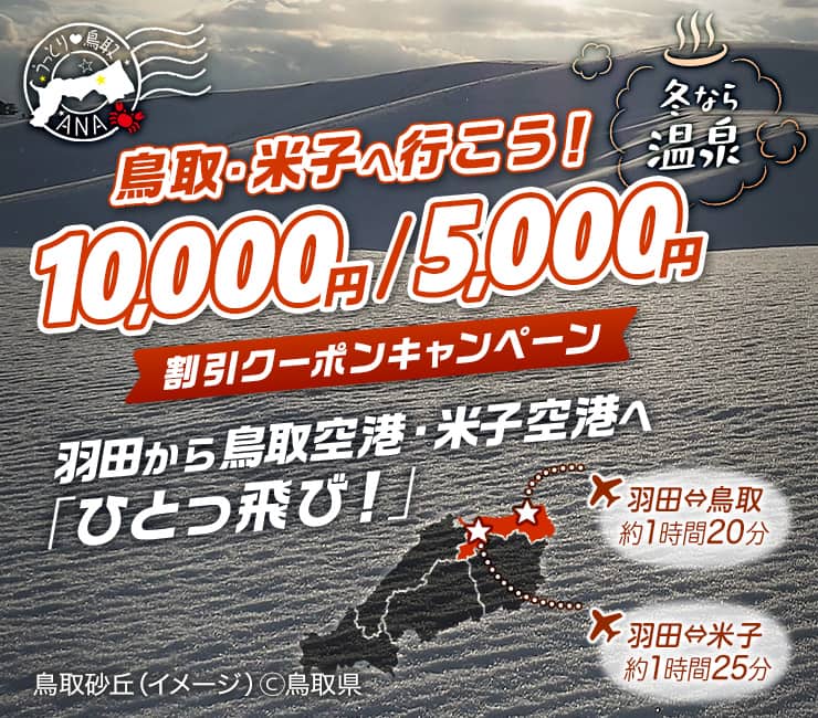 羽田鳥取線ANA291便、羽田米子線ANA381便のご利用が断然おトク!先着50名様にお一人様10,000円割引クーポンをご用意!