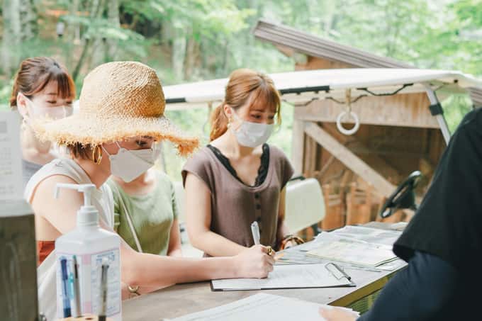 受付をして園内での過ごし方について説明を受けます。豊かな自然を守るために原則としてごみは持ち帰り、排ガスが出る車は園内に入れません。荷物が多い人、体が不自由な人のために電動カートも用意しています。