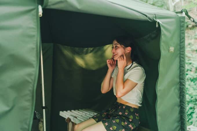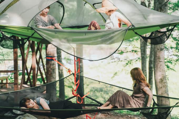 中国地方のキャンプ場では初導入の空中テントは、日常では体験できない視点で森の中をゆったりと楽しめます。木に3点張りして地面に水平にピンと張ったテントは、まるで宙に浮いているような感覚。仰向けになって空に広がるブナの枝葉や雲の形を眺めていると、いつの間にか夢の世界へ。セラピー効果もあるとか。