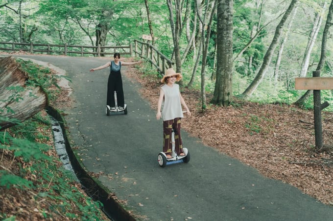 坂道の多い森の中を風を切って移動できるセグウェイは、排ガスを出さない移動手段として導入されました。体重移動だけで前や後ろに移動でき、初心者でも簡単にコツをつかめます。16歳以上利用可能。自分の体の一部のように動かせる独特の乗り心地を楽しめます。