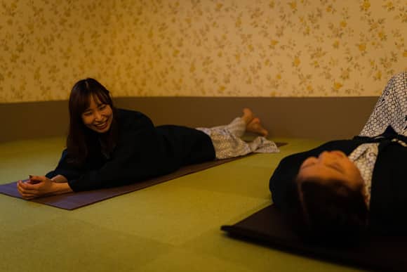 木屋旅館は足元湧出の自家源泉を持ち、42℃以上の高温泉、中性の水質、火山ガス皆無という特徴があります。地下の「ホルミシスルーム」では源泉の真上でラドンオンドル体験ができ、25℃の温かい床に寝転んでいると思わずウトウト。1回あたりの目安は10~30分です。温熱効果で体が芯から温まり、目覚めると体がすっきりとします。「穴ぐらの湯」ではラジウムミストセラピーといって、ラジウム源泉のミストサウナが体験できます。乾式サウナと違って呼吸が楽にでき、お肌もしっとり!
