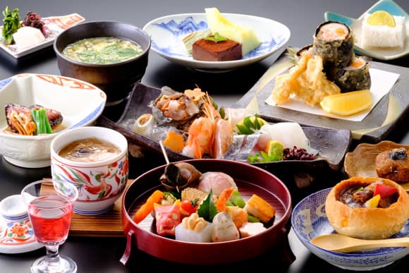 その土地の料理は、旅の楽しみのひとつ。木屋旅館では契約農家の野菜や日本海の海の幸を中心に、新鮮で安心・安全な食材を使った料理を提供しています。春は山菜、夏は岩ガキや白イカ、秋は栃餅やシマダイ、そして冬は山陰の味覚の王様・松葉ガニやノドグロなど、季節を感じる旬のお料理は、味はもちろん見た目も華やか!