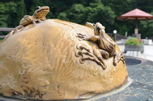 5〜7月には三朝川に生息する「かじか蛙」の鳴き声が聞こえます。かじか蛙は三朝温泉のシンボルです。街を歩くと様々なオブジェに出あうことができます。