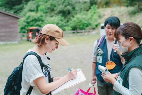まずは現地で受付をします。服装は長袖、長ズボン、帽子、トレッキングシューズなどの歩きやすい靴。リュックには防寒着や雨具、タオル、飲み物などを入れておきましょう。受付の際に、芦津の天然水と智頭のお菓子のプレゼントも。オプションでストレスチェックも受けられます(500円(税込み))。
