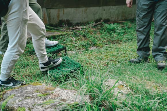 準備体操をして、さっそく出発!……の前に、森の自然を守るために靴の裏についているかもしれない外来種の種子などをマットでしっかりと落とします。森の入り口では水琴窟(すいきんくつ)を発見。「キーン」という神秘的な音色で森林セラピーがスタートです。