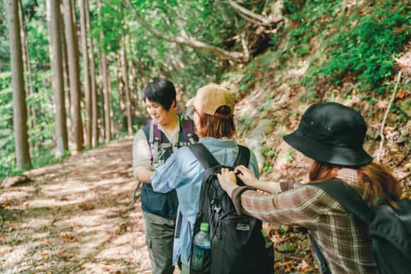 森の中は植物にあふれています。コケだけでもジャゴケやヒノキゴケなどさまざま。ガイドさんが説明をしながら香りをかがせてくれたのは、料理にお馴染みのサンショウや、爽やかでウッディーな香りのクロモジなど。こうした森の天然成分が集まったものを「フィトンチッド」と呼び、森林浴効果やリフレッシュ効果をもたらしてくれます。揮発性なので、午前中のほうが成分は森にとどまっているとのこと。
