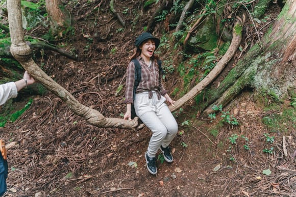 町の産業である杉は、大きく成長するまで80年かけて大切に守られます。芦津渓谷の杉林は大体樹齢30年くらい。豪雪地帯なので冬は3~4mもの雪が積もり、重みに耐えて成長した木々はダイナミックなカーブを描いて上へ上へと伸びていきます。倒れてしまった木は、また別の新たな生命をはぐくみます。ファンタジーのような世界が広がる森の中は、何とフジノキの天然のブランコまでありました。