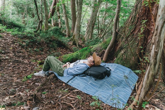 今回のセラピーロードの最終地点「巨木の広場」に到着。ブナやミズナラの原生林がそそり立ち、あるいは横倒しになり、自然が循環する姿をありありと見せてくれます。ここでは森の木々に寄り添って寝転び、自然との対話の時間。ゴツゴツとした幹に寄り添って目を閉じると、ひんやりとした渓谷の空気に包まれて心が浄化されるようです。